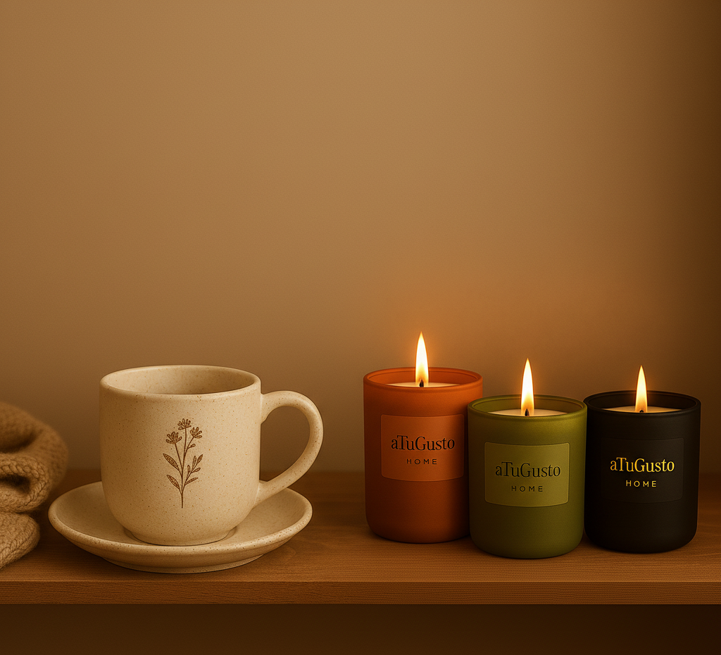 Incluye nuestra taza “Calma”, ideal para tu bebida favorita, y un set de tres velas aromáticas hechas con cera vegetal, que llenan tu espacio de armonía y buen humor.
